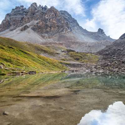 Auf dem Weg – der grösste Teil des Aufstiegs zur Farcletta digl Lai Grand (2659 m ü. M.) ist geschafft – gleitet der Blick übers Alperschälli-Seeli. Man könnte das kleine, klare Seeli unrühmlich als Pfütze abtun, präsentierte es sich nicht als zauberhafter Farbtupfer inmitten der kargen, steinigen Landschaft. Und es liegt an einem willkommenen Ort, denn hier möchte man pausieren. Auf einem Stein sitzend – nein, für ein Bad ist das von Schmelzwasser gespiesene Seeli zu frostig – holt man nun genussvoll Leckereien aus dem Rucksack. Ja, auch diese gehören zur Standartausrüstung. Beim Picknicken schliesslich geniesst man das aufkommende Bewusstsein, dass man sich hier vollkommen alleine inmitten der Bergwelt befindet. Alleine? Vielleicht ja. Oder doch nicht? Denn gut möglich, dass es hier zu einer Begegnung mit dem Capricorn, dem König der Alpen, kommt.