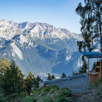 Aussichtspunkt oberhalb von Feldis mit herrlicher Aussicht auf das UNESCO Welterbe Sardona mit einer weltweit einzigartigen Sichtbarkeit der Gebirgsbildung.