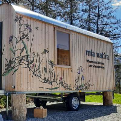 Die kleine Ausstellung mia natira im ausgebauten Bauwagen gibt Einblick in die Kulturlandschaft und Artenvielfalt am oberen Schamserberg.