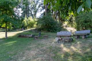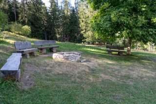 Die Feuerstelle liegt am Waldrand, auf einer Wiese.