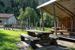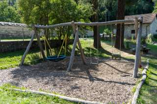 Den Spielplatz findet man direkt bei der historischen Holzbrücke. Wenn man die Brücke vom Dorf her überquert, gleich auf der rechten Seite.
