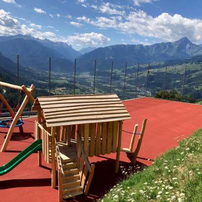 Der Spielplatz befindet sich beim alten Schulhaus Scheid und verfügt über eine wunderbare Aussicht ins Domleschg und auf den Heinzenberg.